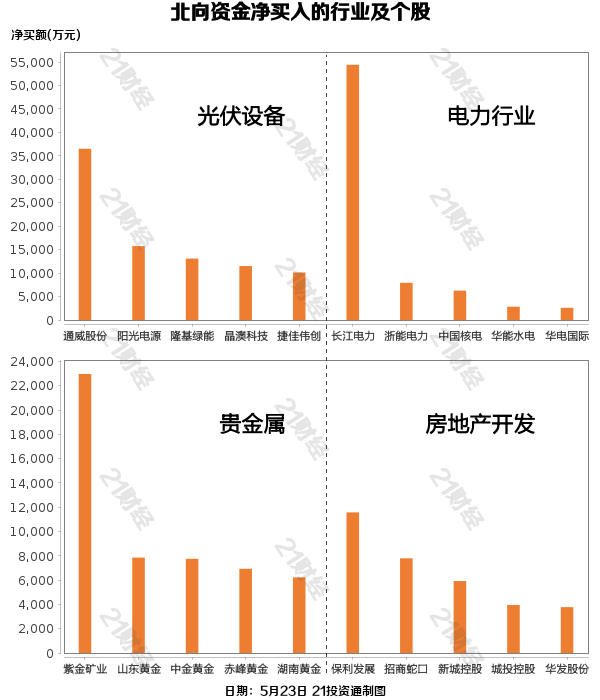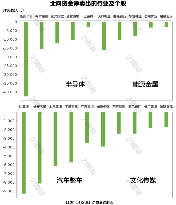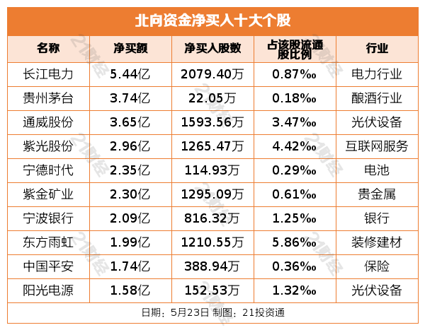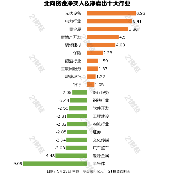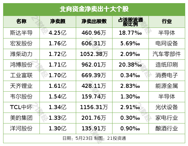据21投资通智能监测,5月23日,北向资金净卖出32.66亿元,其中沪股通净卖出11.26亿元,深股通净卖出21.4亿元。