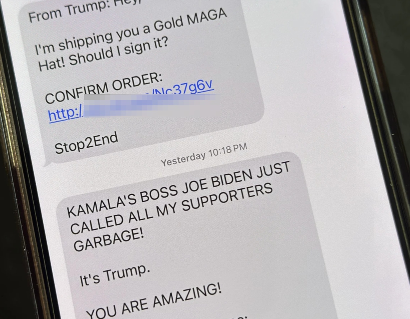 除了庸碌的竞选短信,一些竞选短信中还包含一些购物或筹款聚拢。特朗普团队在短信中写谈:“我是特朗普。我不错给你一顶金色MAGA(特朗普竞选标语)帽子!我还可能在上头签名,请点击聚拢阐述订单。”该聚拢指向购买页面,页面浮现这顶帽子售价为50好意思元。