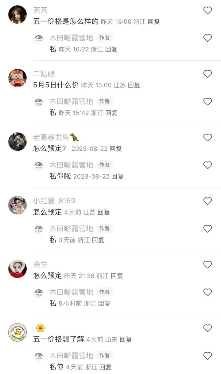 在木田峪露营基地的小红书账号留言区,在近300条挑剔中,对于“五一”的预订征询多达一半。“众人不是说露营不火了吗?怎么订个房这样难。”江女士说,她原定和家东谈主“五一”时期去安吉游玩,早在4月中旬征询时就发现预约不上了。