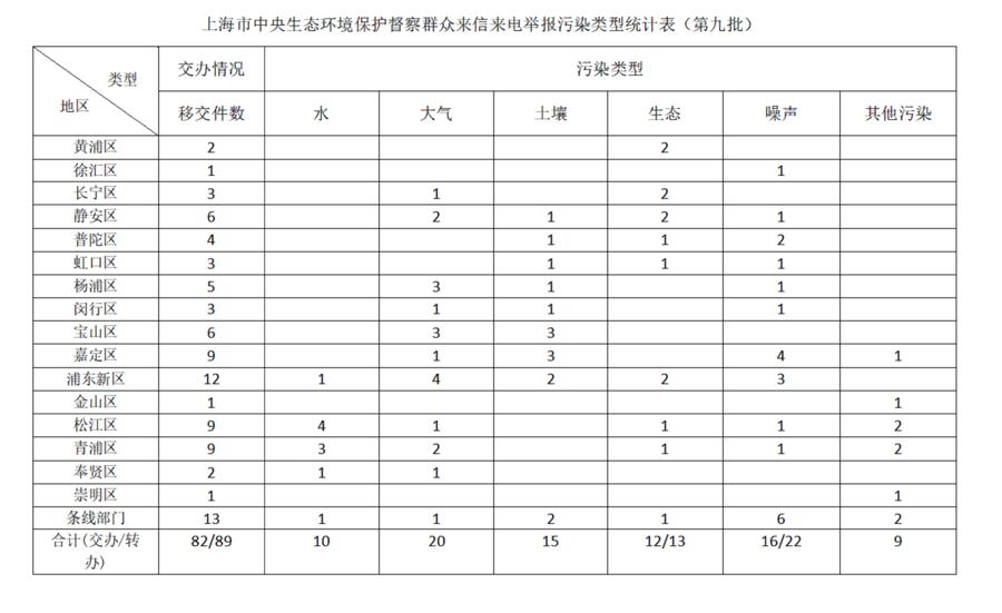 从信访举报件波及的生态环境问题类型来看,波及水10件、大气20件、泥土15件、生态13件、噪声22件、其他类型9件。波及各区76件:黄浦2件,徐汇1件,长宁3件,静安6件,普陀4件,虹口3件,杨浦5件,闵行3件,宝山6件,嘉定9件,浦东12件,金山1件,松江9件,青浦9件,奉贤2件,崇明1件。波及条线部门13件。